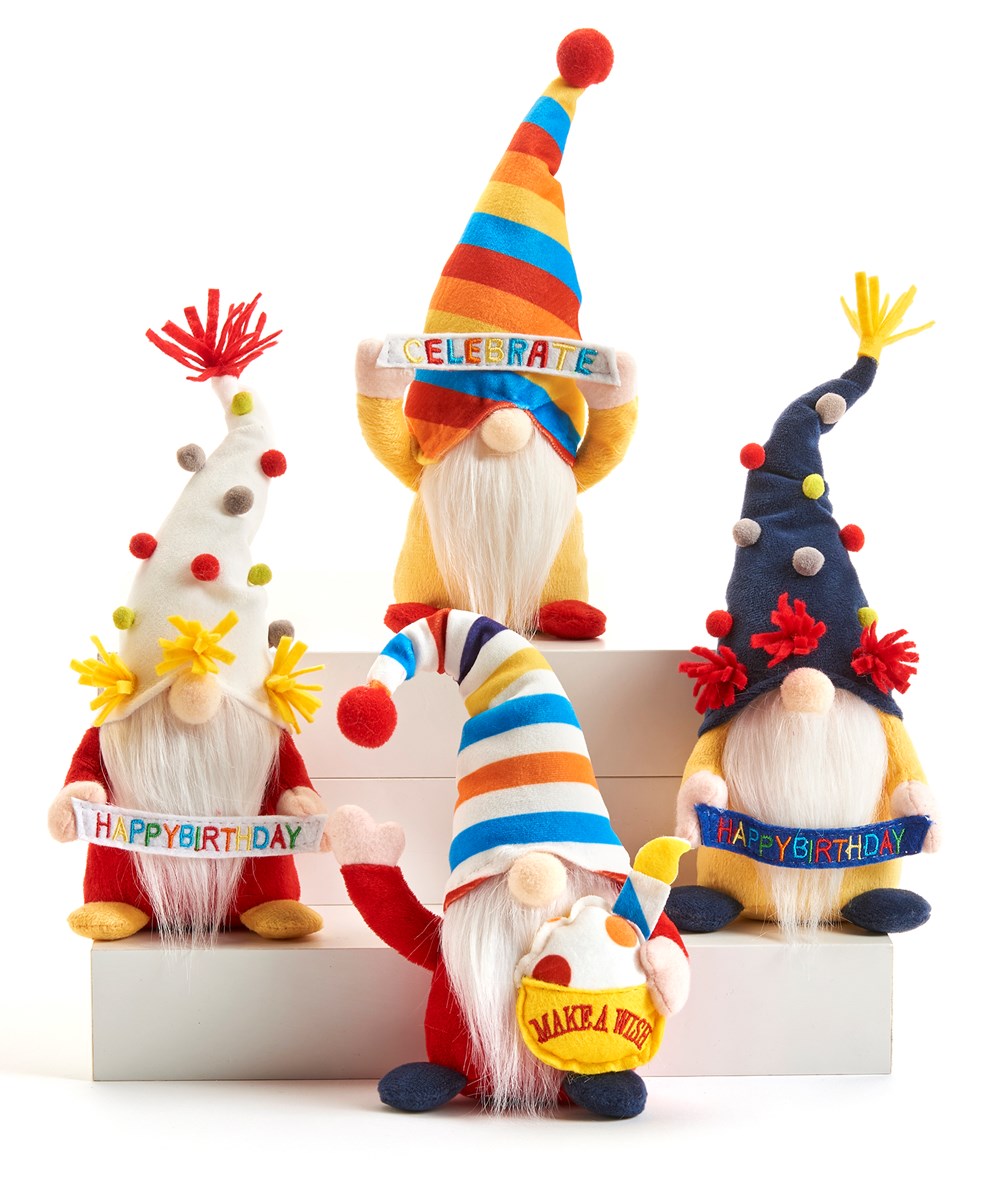 Soft plush gnome dressed ready for a celebration with birthday wishes sentiment in bright colored typography. Available in 4 assorted designs: Rainbow Hat/CELEBRATE, Red & White Gnome/HAPPY BIRTHDAY, Striped Hat/MAKE A WISH, Navy Hat/HAPPY BIRTHDAY. 12 pieces in a wood crate displayer (11.8x7.1x2.4) at no charge. Polyester.