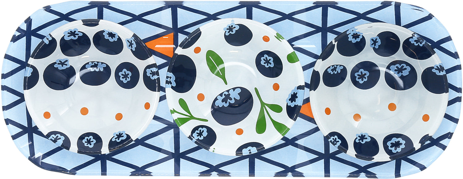 The tray is 11” long x 4.25” wide x 1” deep. Each of the three bowls is 3.25” long & wide x 1” deep, holding 2 Oz each. All four pieces are constructed from glassware with a glossy interior finish and a matte exterior finish. The tray is ideal for holding snacks while the bowls are ideal for holding dipping sauce options; great summer party serveware.