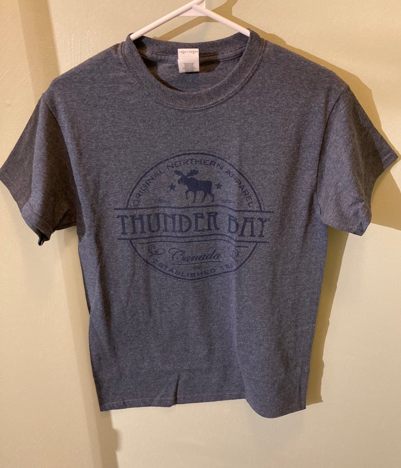 Blue Heather with coin moose design. 90% cotton, 10% polyester. Unisex sizing.
